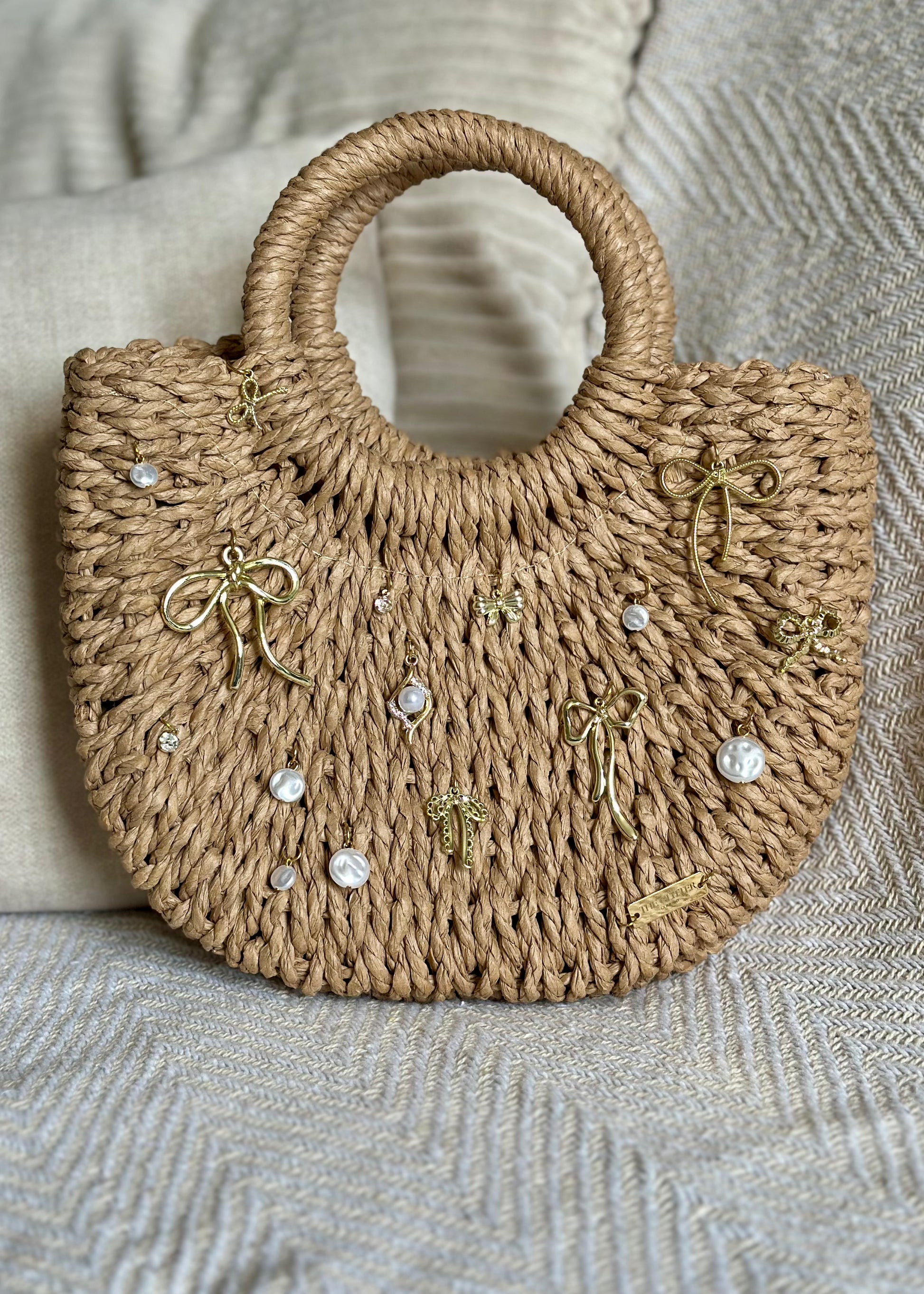 - De bedels worden met de hand op de tas bevestigd, waardoor de positie licht kan variëren.